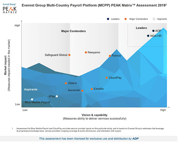 The Everest Group has named ADP® a leader in its latest Multi-Country Payroll Platform PEAK Matrix Report! The report, which analyses the changing dynamics of the multi-country payroll platform market, assesses the market success and overall delivery capability of service providers. Everest Group classifies service providers based on three categories: Leaders, Major Contenders and Aspirants. The PEAK Matrix is a framework used to assess the market success and overall delivery capability of service providers. Those in the Leaders category, according to the Everest Group, are significantly ahead of other providers, especially in terms of platform functionality. According to Everest, ADP dominates the multi-country payroll market, citing factors that include its widespread coverage across the globe, large scale of operations and continued investments in building advanced technological capabilities.