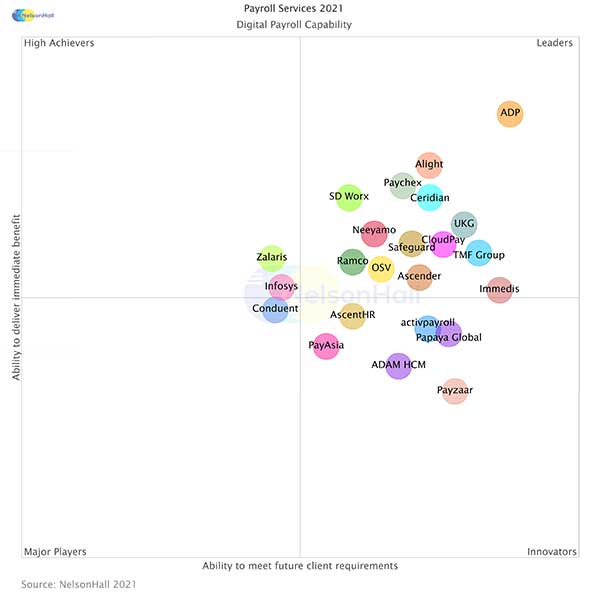 NelsonHall named ADP a leader in their Payroll Services NEAT 2021 report for overall digital payroll capability, multi-country payroll and performance in the Asia Pacific region. This marks the seventh year that NelsonHall has named ADP a Leader in their Payroll Services NEAT report. ADP’s expanded digital capabilities proved well-positioned to meet the challenges of today’s economy as firms seek to future-proof payroll operations globally.